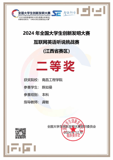 近日,2024年全国大学生创新发明大赛互联网英语听说挑战赛省决赛圆满落幕,经过激烈角逐,必赢官网必赢国际437官网24级英语专业学生陈如曼获得二等奖。