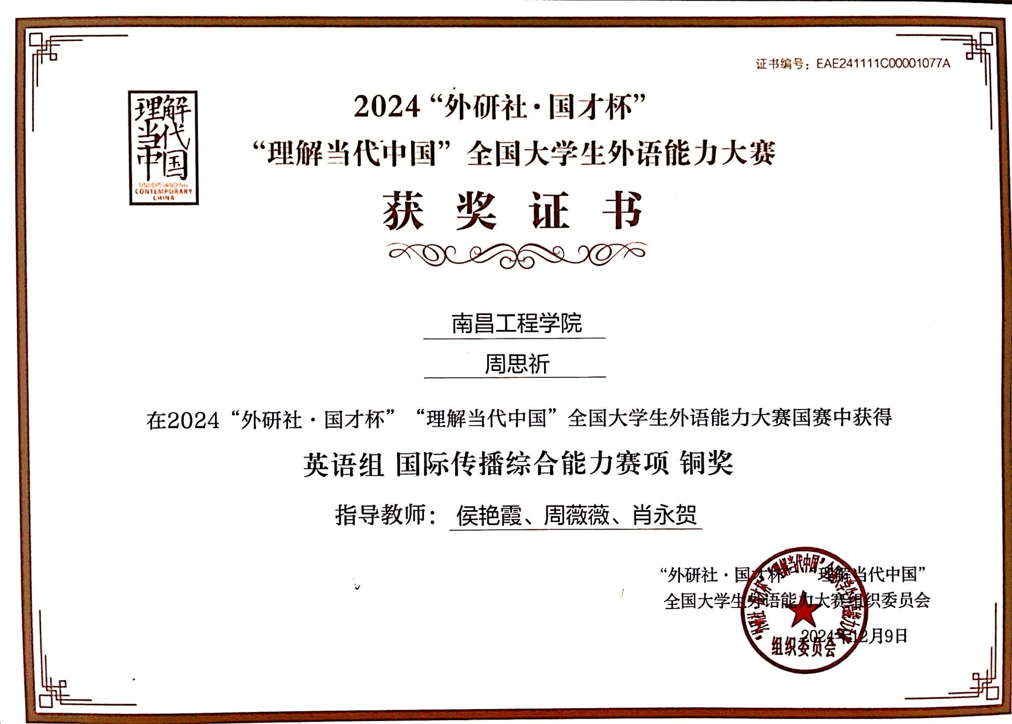 必赢官网学子在2024“外研社•国才杯”“理解当代中国”全国大学生外语能力大赛英语组国际传播综合能力赛项喜获佳绩