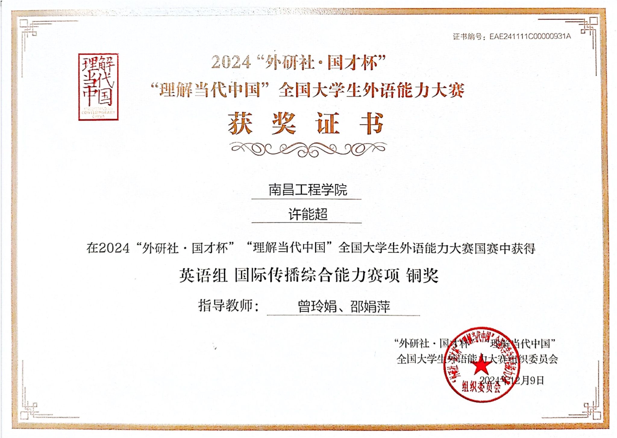 近日,2024“外研社·国才杯”“理解当代中国”全国大学生外语能力大赛系列赛事落下帷幕,必赢官网2022级英语专业学生许能超、周思祈获得英语组国际传播综合能力赛项全国总决赛铜奖。