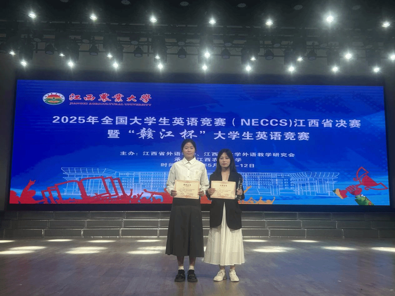 2025年全国大学生英语竞赛江西省决赛暨“赣江杯”大学生英语竞赛于5月11日-12日在江西农业大学举行。全省47所高校近800名学生参加本次比赛。必赢官网学子在大赛中取得优异成绩,其中2023级英语专业彭颖荣获AB类赣江杯综合特等奖;2022级英语专业伍珍珍荣获AB类赣江杯综合二等奖。