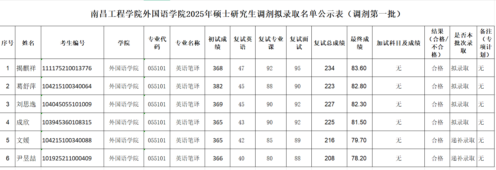 南昌工程学院必赢国际437官网2025年硕士研究生调剂拟录取名单公示表(调剂第一批)