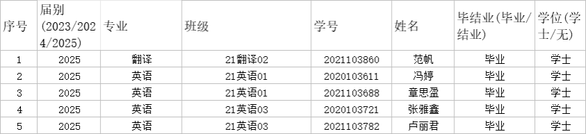 2025届第二批通过毕业审核(符合毕业及学位授予条件)的本科生名单(共5名必赢国际437官网学生)。