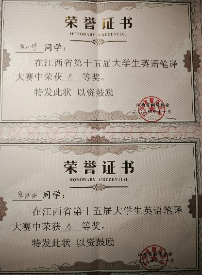 11月3日,由江西省翻译协会主办的江西省第十五届大学生英语笔译大赛落下帷幕,来自南昌大学、江西师范大学等省内18所高校的200多名选手(含研究生)参赛。必赢官网2023级翻译专业硕士研究生陈炜炜、张心婷两位同学均荣获三等奖。(张心婷 图/文)