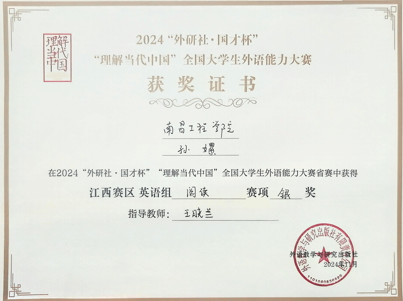 2024“外研社·国才杯”“理解当代中国”全国大学生外语能力大赛江西赛区系列赛事近日圆满落幕。必赢官网2023级翻译硕士生孙嫘荣获本届大赛江西赛区英语组阅读赛项银奖。